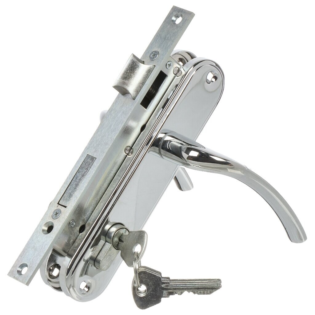 Замок врезной цилиндровый с защёлкой в комплекте с ручкой ЗВ4-70.27 подходит для установки в деревянные двери. Имеет межосевое расстояние 70 мм. Ручки на планке с многослойным гальваническим покрытием. в комплект входит цилиндр 70 мм.
